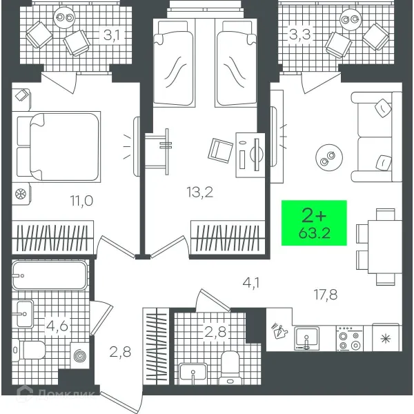 2 комн. квартира в Тюмени в ипотеку от 61 136 руб/месяц