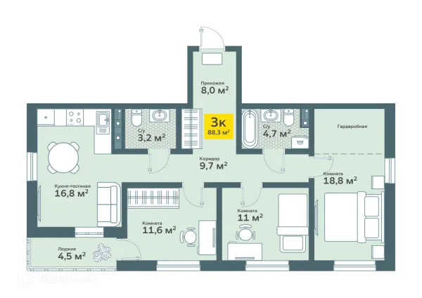 3 комн. квартира в Тюмени в ипотеку от 64 449 руб/месяц