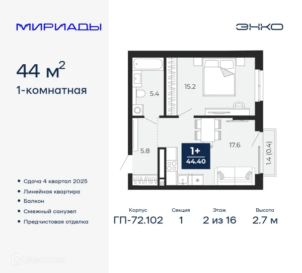 1 комн. квартира в Тюмени в ипотеку от 44 415 руб/месяц