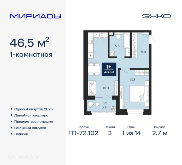1 комн. квартира в Тюмени в ипотеку от 46 450 руб/месяц