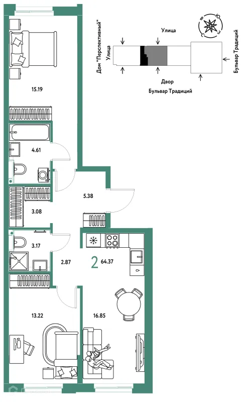 2 комн. квартира в Тюмени в ипотеку от 61 678 руб/месяц