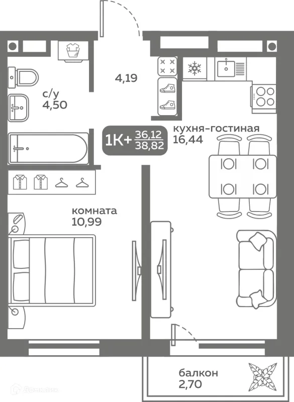 1 комн. квартира в Тюмени в ипотеку от 38 597 руб/месяц