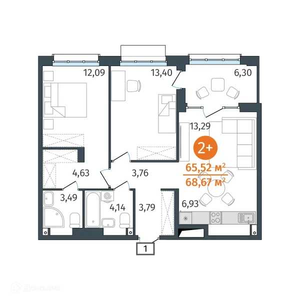 2 комн. квартира в Тюмени в ипотеку от 65 889 руб/месяц