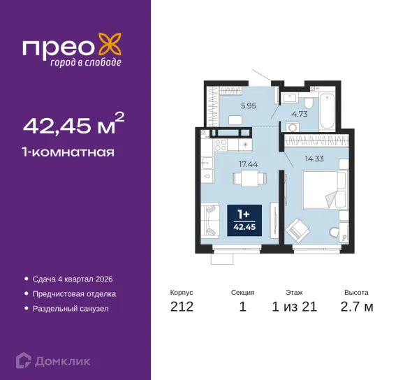 1 комн. квартира в Тюмени в ипотеку от 44 945 руб/месяц