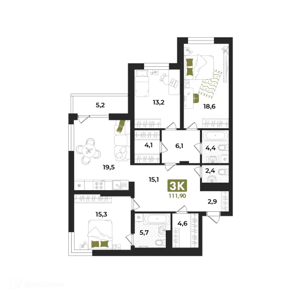 3 комн. квартира в Тюмени в ипотеку от 129 618 руб/месяц