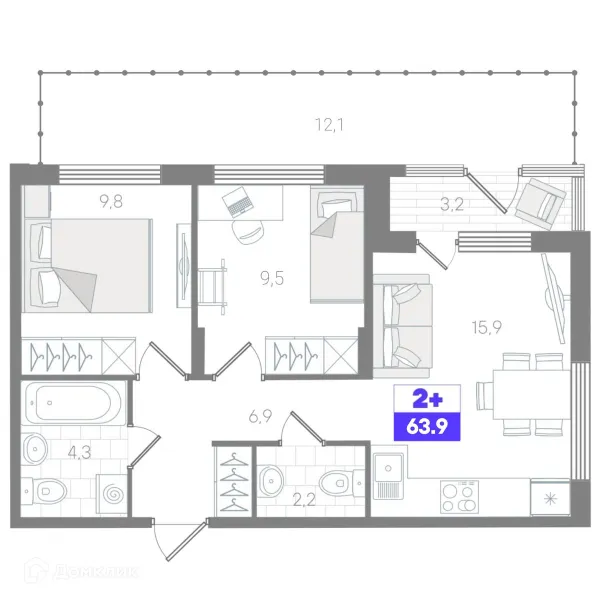 2 комн. квартира в Тюмени в ипотеку от 86 628 руб/месяц