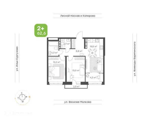 2 комн. квартира в Тюмени в ипотеку от 42 579 руб/месяц