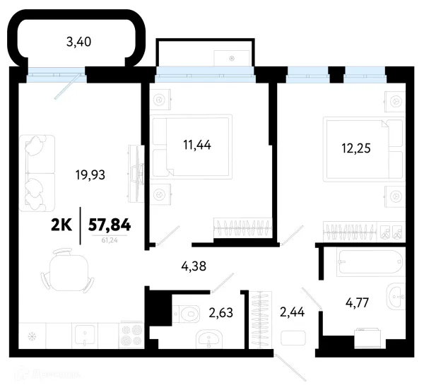 2 комн. квартира в Тюмени в ипотеку от 53 935 руб/месяц