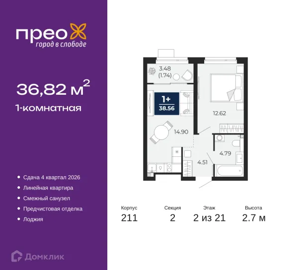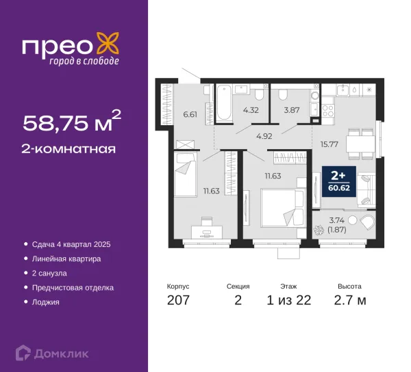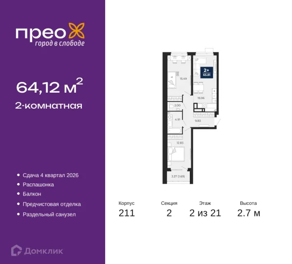 2 комн. квартира в Тюмени в ипотеку от 57 762 руб/месяц