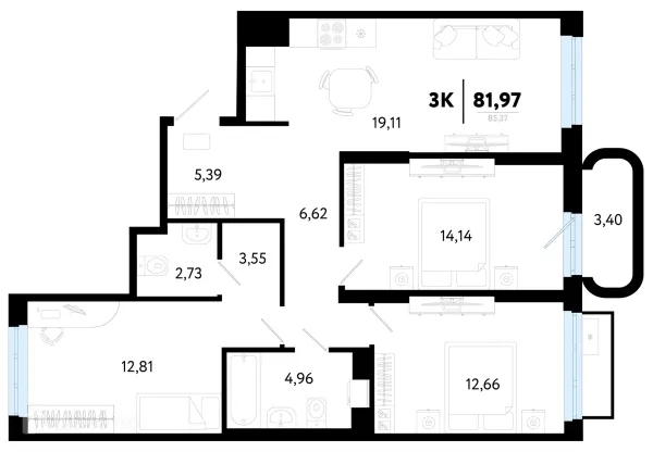 3 комн. квартира в Тюмени в ипотеку от 66 897 руб/месяц