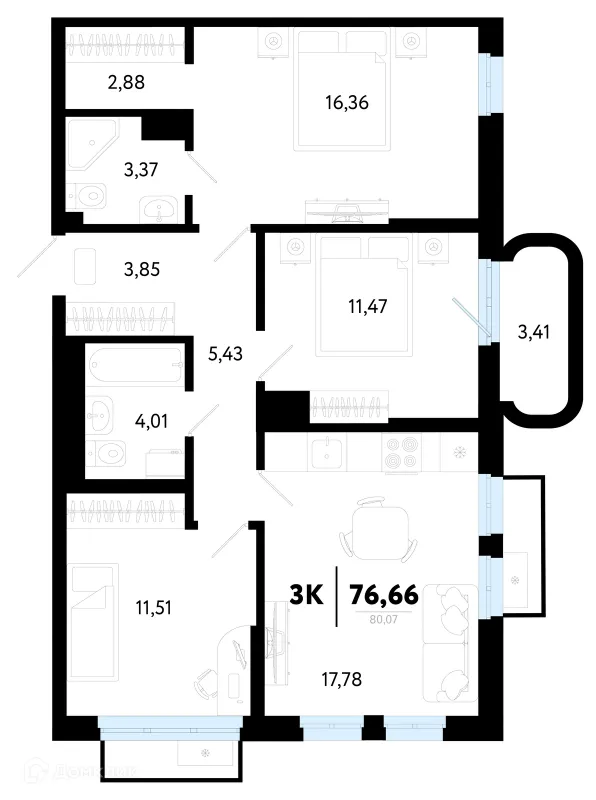 3 комн. квартира в Тюмени в ипотеку от 65 457 руб/месяц