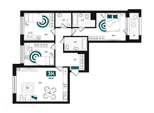 3 комн. квартира в Тюмени в ипотеку от 65 457 руб/месяц