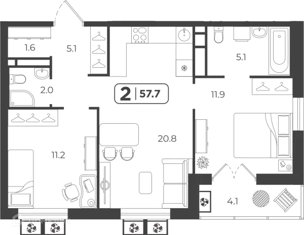 2 комн. квартира в Тюмени в ипотеку от 70 209 руб/месяц
