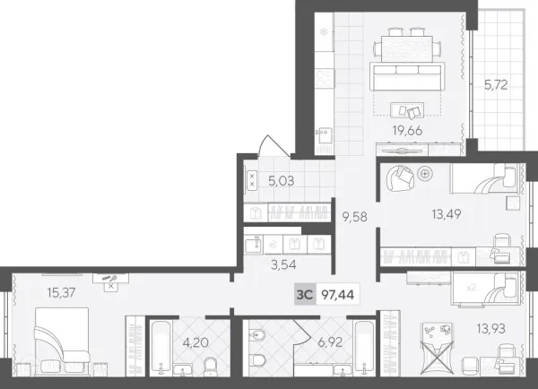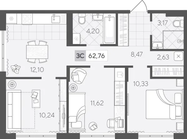 3 комн. квартира в Тюмени в ипотеку от 70 569 руб/месяц