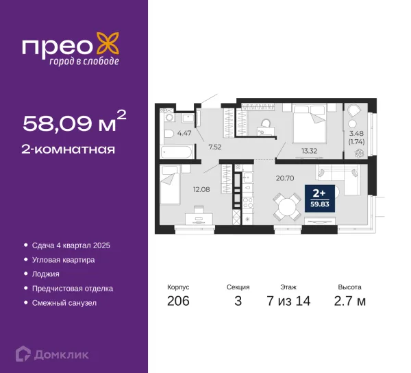 2 комн. квартира в Тюмени в ипотеку от 59 699 руб/месяц
